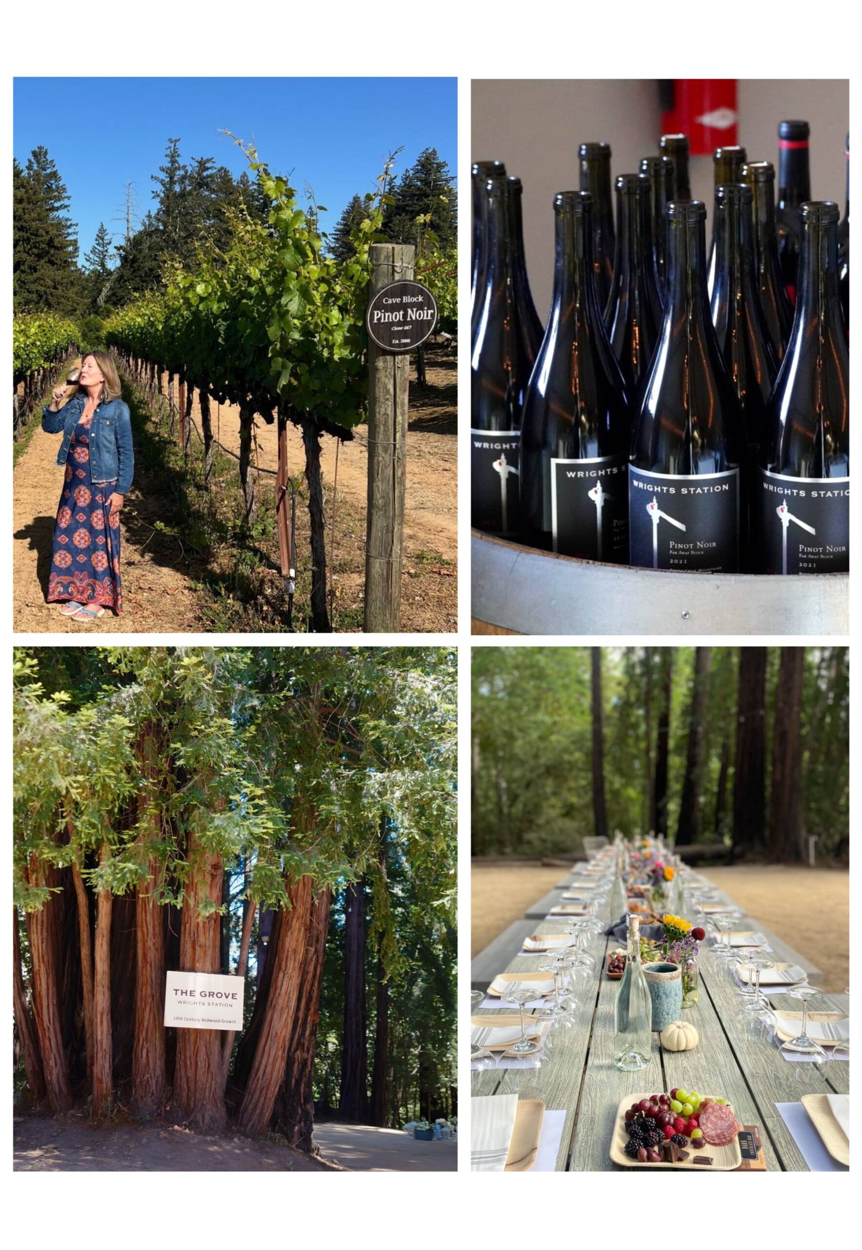 Enjoy a guided wine tasting beneath the Redwoods with Carol Martin. We’ll take a leisurely stroll through the vineyard to the redwood grove, where we’ll settle in and tast a vertical flight of Wrights Station Pinot Noirs. Dan Lokteff, the owner and wine maker, will make a guest appearance–straight from the cellar to the grove as we have begun harvest.